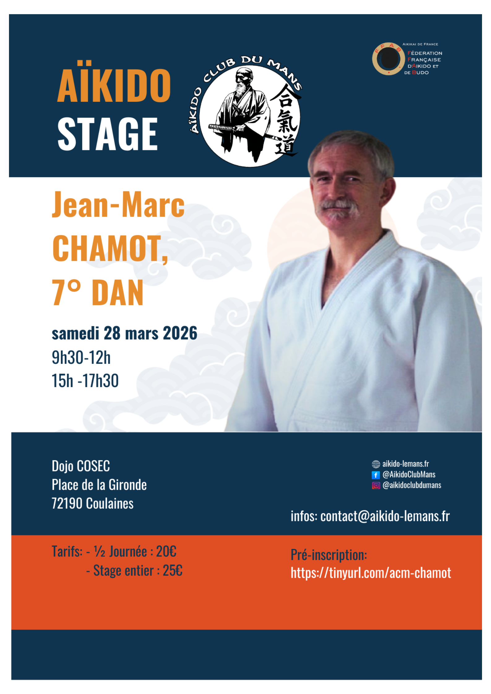 Stage J-M. Chamot 28 Mars Stage organisé par l'Aïkido Club du Mansanimé par Jean March Chamot 7e Dan Dojo Rue de la Gironde, 72190 Coulaines Samedi 28 mars 202609h30 - 12h0015h - 17h Tarifs : 1/2 journée : 20€Stage complet : 25€ Préinscriptions ici Suivant